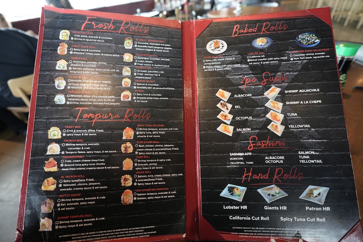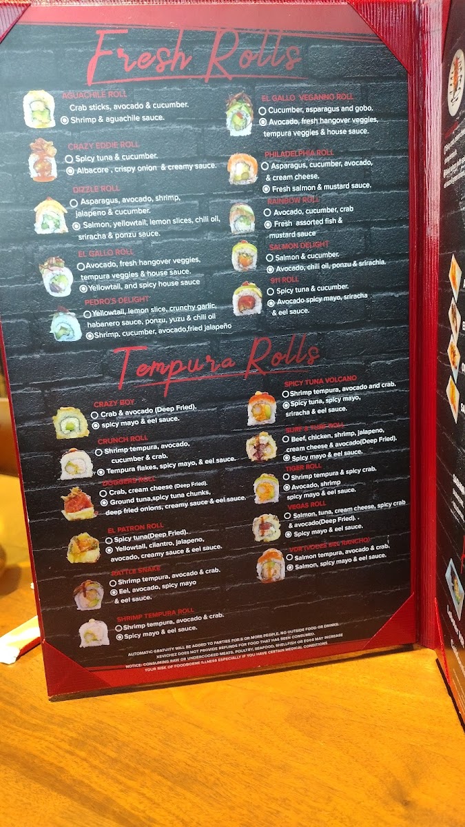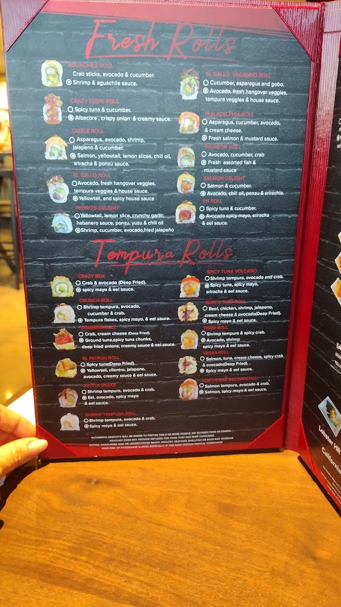Inside: shrimp, cucumber, avocado, and fried jalapeno. Outside: yellowtail, lemon, jalapeno, crunchy garlic, habanero sauce, ponzu sauce, yuzu, and chili oil.