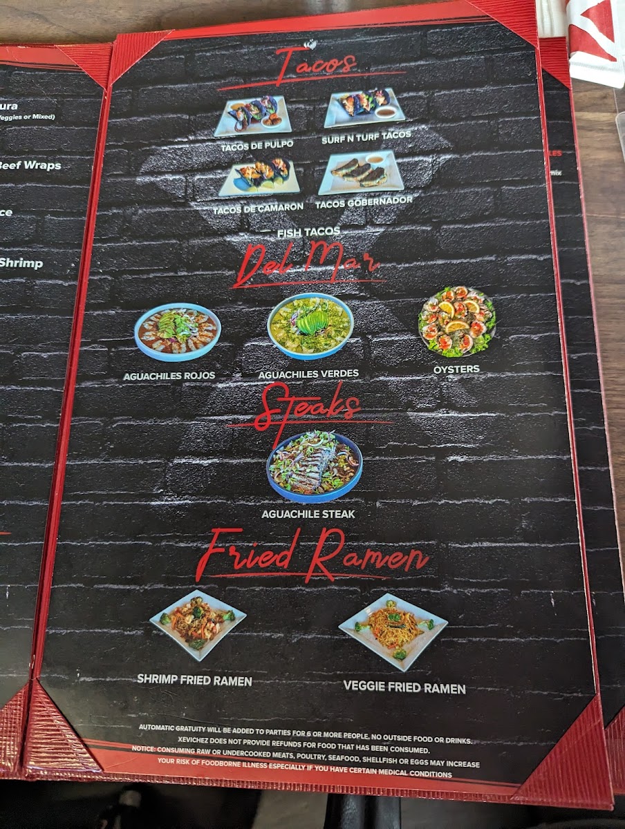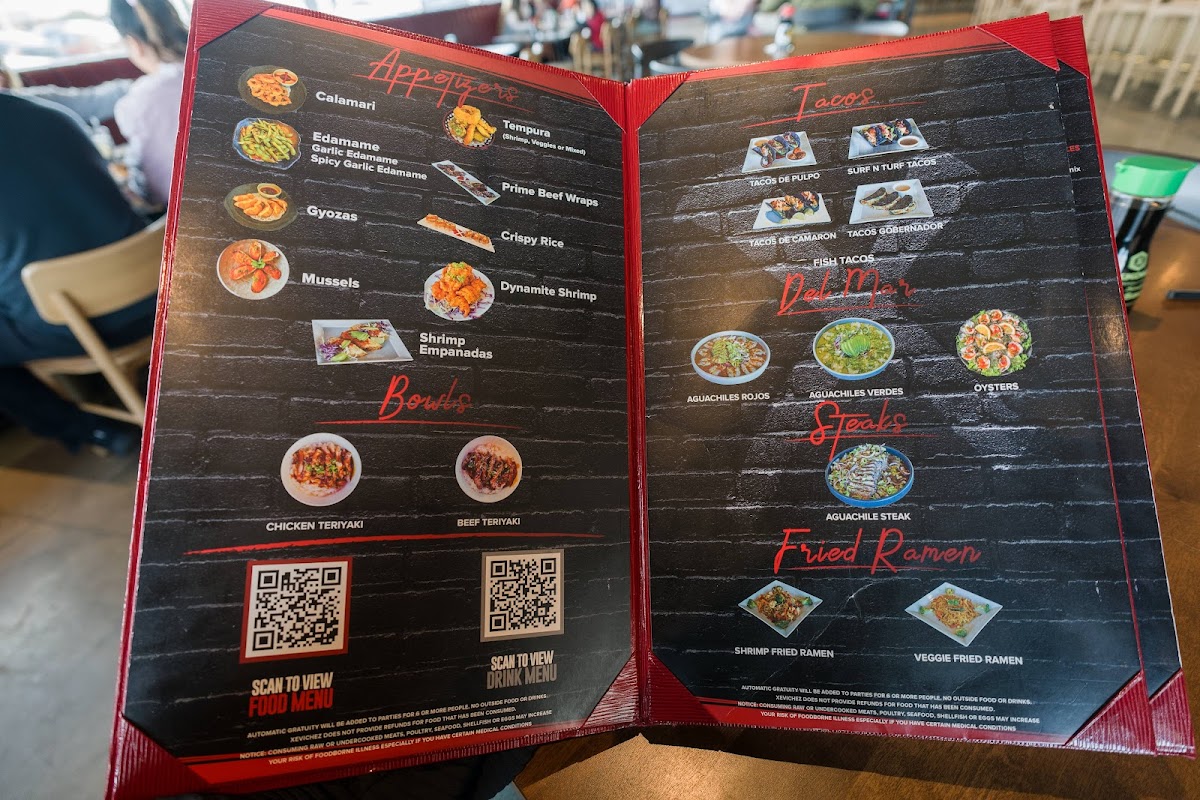 Inside: cucumber, shrimp, and avocado. Outside: New York steak, aguachile veggie, and aguachile negro sauce.